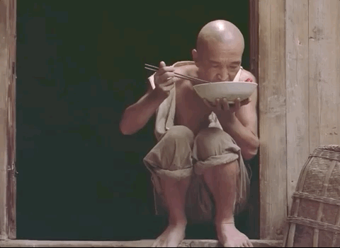 小小的個子縮蹲在門邊兒,比臉更大的碗像是盛滿了慾望。