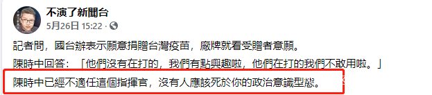 然而,對於大陸的善意,島內直接負責應對新冠疫情的官員陳時中竟然表示,“他們沒在打的(BNT疫苗)我們有一點興趣,他們有在打的,我們不敢用”。