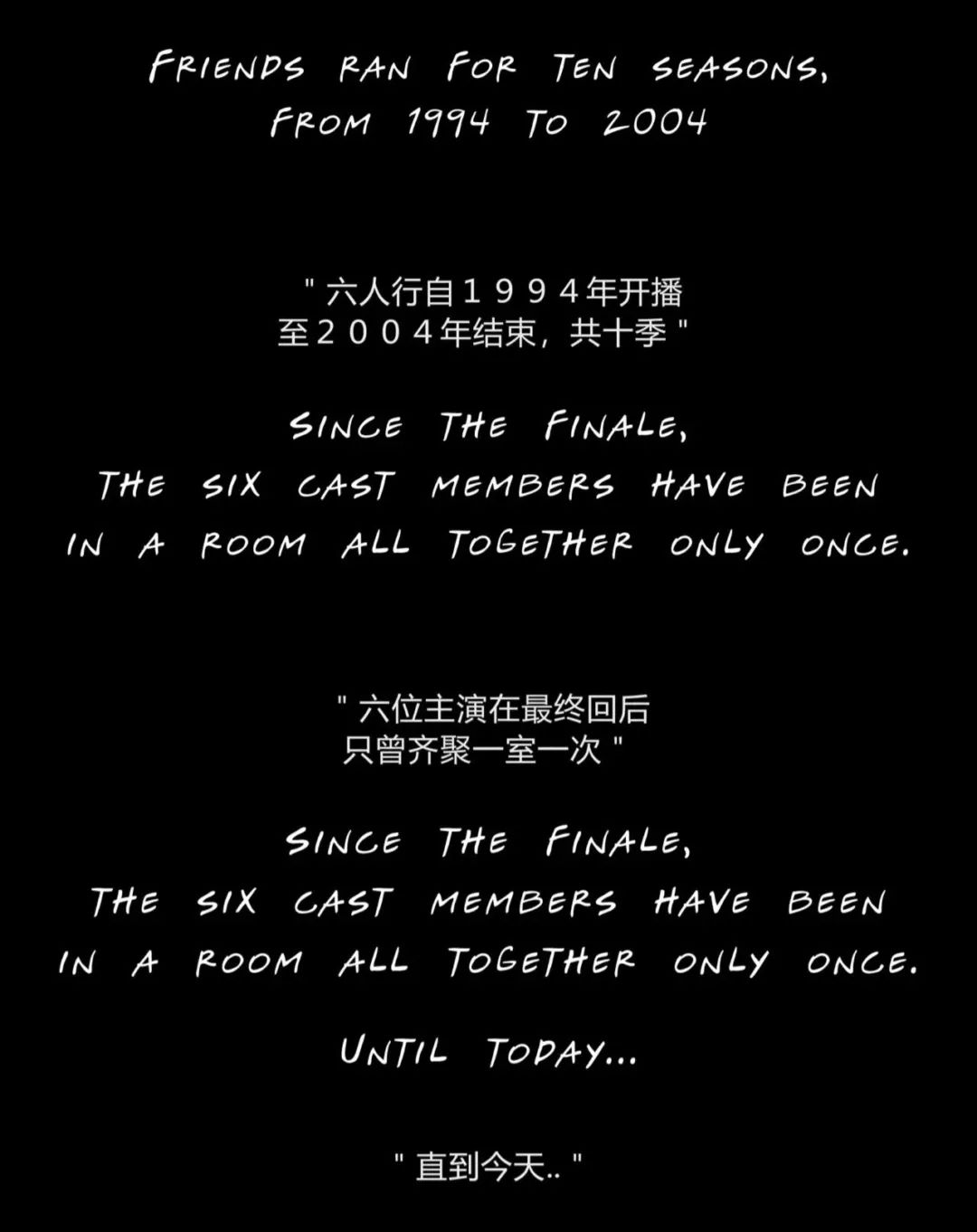 《老友記重聚特輯》的第一幕,“《老友記》自1994年開播至2004年結束,共十季。六位主演在最終回後只曾齊聚一室一次,直到今天。”