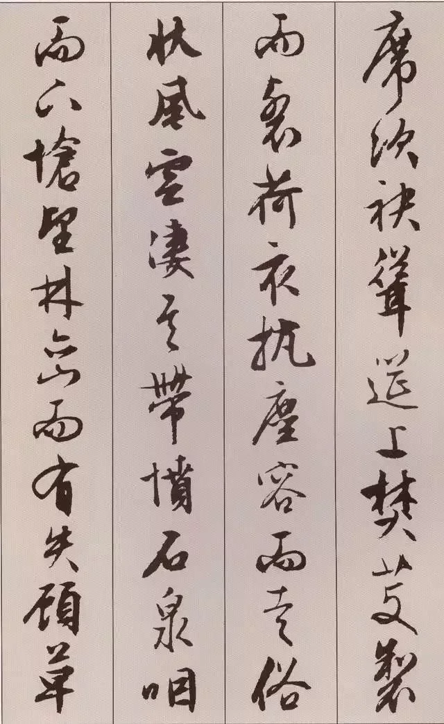 文徵明的草書除學二王以及智永小草之外,也學懷素、黃山谷的狂草。最常見的還是前一類小草,且時常融入他的小行書中,狂草作品很少,僅見他分別作於43歲、50歲、51歲的三件作品。43歲應友囑作《東林避暑圖卷題詩》(現藏紐約美術館)以黃山谷行書、狂草及蘇體行書各書詩一首。其中狂草《上巳日獨行溪上有懷》十七行,體由山谷及狂素。50歲所作《草書卷》(現藏無錫博物館)則是學山谷狂草《竹枝詞》後有所得而擬其筆意所作。51歲所作《八月六日書事·秋懷七律詩合卷》(現藏上海博物館)則已脱去山谷狂草形骸,直逼懷素神意。此幅與以狂草見長的祝枝山相比,毫不遜色。文徵明的隸書作品不多,但他頗為自得。主要學鍾繇、梁鵠等。他有時以隸書作跋,如《跋範庵石湖詩卷》《跋康裏子山書李白詩》等;也常作四體千字文(正、草、隸、篆);有時以大字隸書作引首。他的大字隸書與小字隸書大異其趣。此外,他曾集漢隸書寫《漢隸韻要》(祝允明校韻,國家圖書館藏),可見他於隸書用功之勤,推廣此體也不遺餘力。文徵明的隸書雖不是他最擅長的書體,卻也是明代隸書風格的典型,恐怕與此舉不無關係。