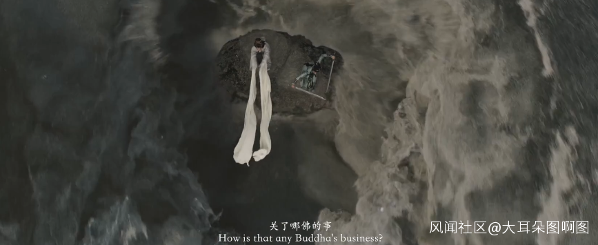 但是,導演又並未徹底摒棄舞台版中水袖的作用——當白素貞怒不可遏,斥責法海“步步相逼”後,她一甩水袖,腳下的江水便隨着她的長袖翻舞起來。