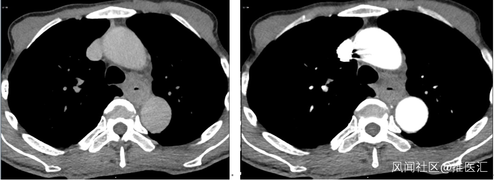 圖1:胸部強化CT圖片;A.靜脈期;B.動脈期