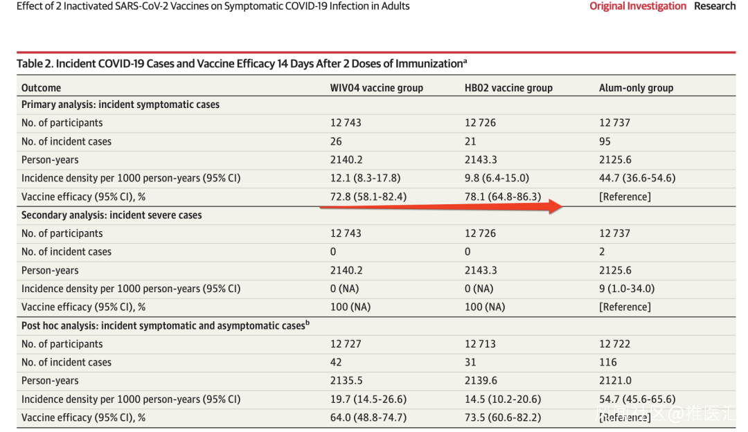在77(1-121)天的中位(範圍)隨訪期間,在WIV04組的26名參與者中發現了有症狀的COVID-19(每1000人年12.1 [95%CI,8.3-17.8]), HB02組為21(每1000人年9.8 [95%CI,6.4-15.0]),僅單純鋁佐劑組為95(每1000人年44.7 [95%CI,36.6-54.6])。與僅使用單純鋁佐劑相比,WIV04的疫苗效力為72.8%(95%CI,58.1%-82.4%),HB02的疫苗效力為78.1%(95%CI,64.8%-86.3%)(P(<0.001) )。