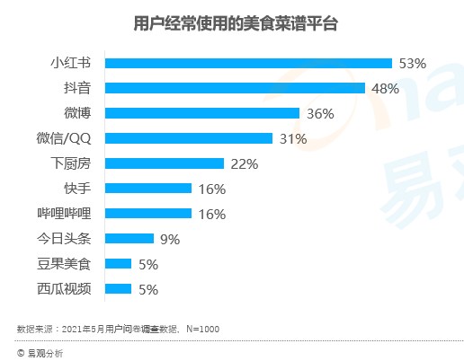 易觀5月26日發佈的《中國美食內容消費用户洞察2021》報告指出,48%的用户會因為受到抖音、小紅書等美食內容激發而下廚。