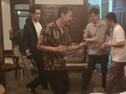 畫面裏,他和桂綸鎂、廖凡等朋友一起,手指夾着香煙跳舞,動作十分妖嬈。