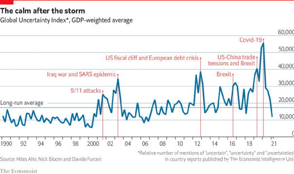 通過檢索經濟學人智庫發佈的143個國家報告中“不確定”詞條出現的頻次,國際貨幣基金組織和斯坦福大學的幾位研究者合作繪製了這條折線圖。由於新冠疫情,全球不確定性在2020上半年達到了歷史頂峯,緊接着一路直降。即使全球感染在增加,人們的信心似乎也正在恢復。