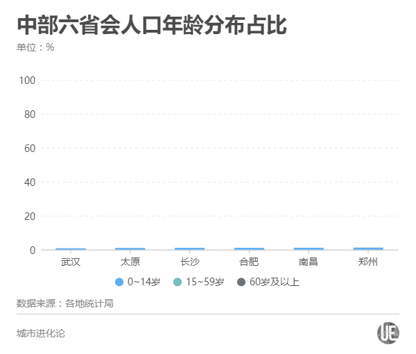 雖然武漢的勞動年齡人口占比達到69.72%,領跑中部六城,但其60歲及以上人口比重達到17.23%,老齡化程度最深,而0~14歲人口比重僅為13.05%,在六城中佔比最低。