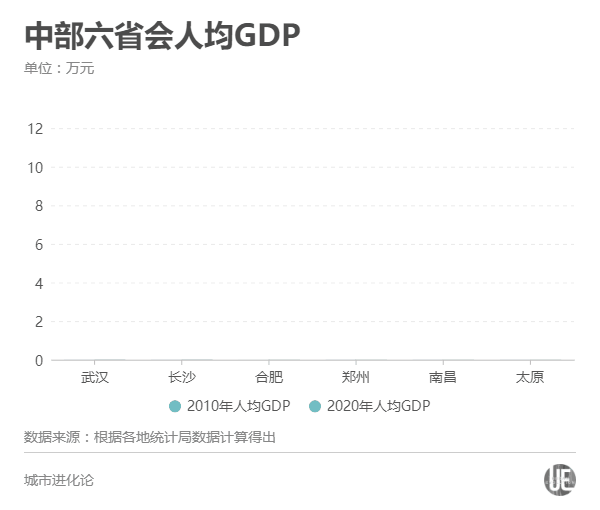 2010年,中部六個省會城市的人均GDP排名依次為長沙、武漢、鄭州、南昌、太原、合肥;2020年,這一位次調整為武漢、長沙、合肥、鄭州、南昌、太原。