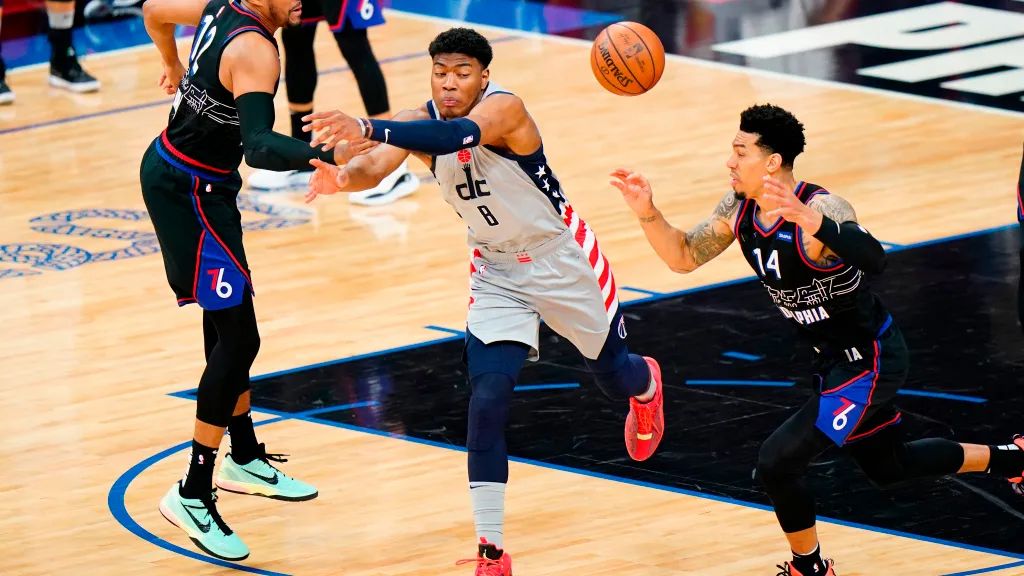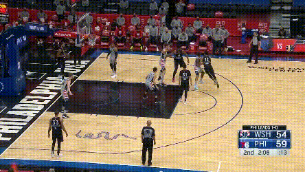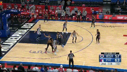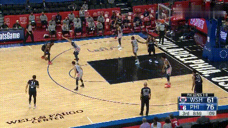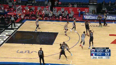 這很像是76人為去年季後賽被持球投打死的過往拿出的新態度——他們從一支深蹲坑球隊,變成了一支內線上提盡力干擾持球投,然後其他各點做一些回收兼顧籃下的球隊。奇才有威少、八村壘這樣的球員,於是76人執行這個策略並不難。