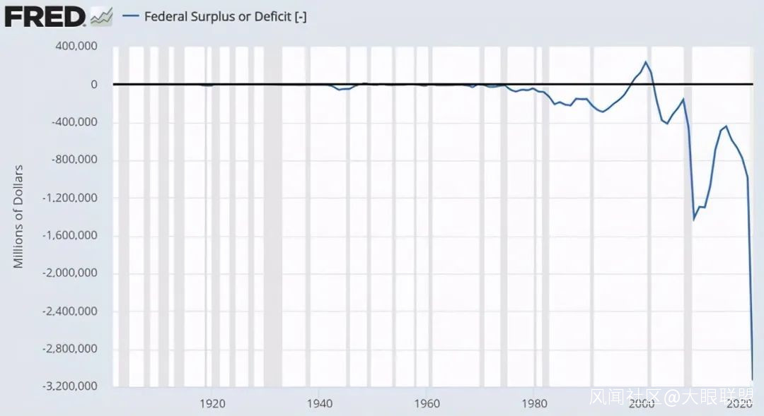美國聯邦政府最高的赤字記錄發生在2020財年。美國政府2020年財政預算 4.79萬億美元,實際收入3.42萬億美元,實際支出6.55萬億美元。聯邦預算赤字為3.1萬億美元,是2019財年赤字9840億美元的3倍多,也比新冠大流行之前2月份政府的估計高出2萬億美元,赤字佔GDP比例也高達16%,是二戰以來最高水平。