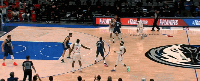 但東契奇還是想要雷吉的換防,所以小哈達威上來掩護,雷吉不想換所以延誤之後想回到哈達威身邊,但卻擋住了隆多返位的路線,東契奇一個加速直接衝向內線。