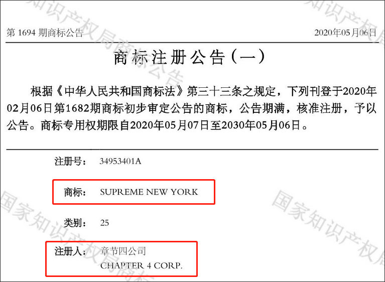 同年11月,Supreme官方陸續在中國獲批一系列商標,如“SUP”和“SUPREME”,這些商標的申請人“章節四公司(Chapter 4)”是Supreme的品牌知識產權所有人。
