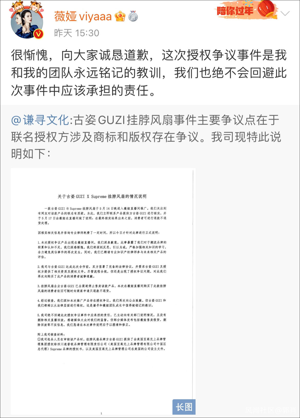 薇婭被指售賣潮牌山寨產品後道歉:不會迴避此次事件中應該承擔的責任_風聞