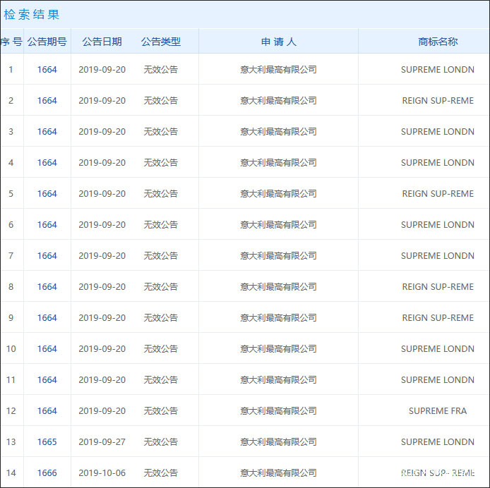 Supreme Italia在中國也註冊了“Supreme London”、“Supreme fra”、“Supreme Ldn”等多個商標,註冊人是“意大利最高有限公司”,2019年9月開始,中國國家知識產權局商標局以“因異議無效”為由,將這些商標陸續判定為無效。