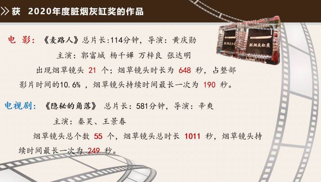 另外,控煙協會還分別評選出了“2020年度無煙影視劇作品”和“2020年度髒煙灰缸獎作品”。
