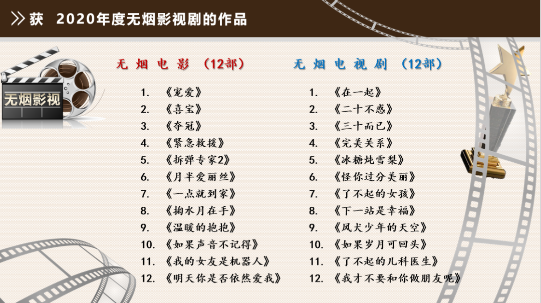 其中,獲“無煙電影”的作品有12部,包括《奪冠》、《緊急救援》、《拆彈專家2》等;或“無煙電視劇”的作品也有12部,包含《在一起》、《三十而已》、《冰糖燉雪梨》等。