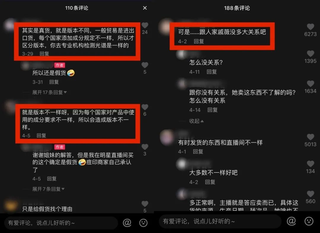 消費者所發維權內容的評論區,也充斥着疑似明星水軍或粉絲的身影,想辦法為明星開脱。例如堅稱消費者購買的是正品,只不過是版本問題。