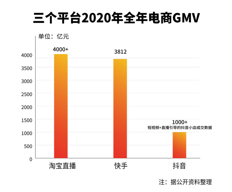 今日網紅髮布的《2021中國視頻電商研究報告》顯示,2020年,淘寶直播GMV超4000億元,快手直播GMV超3800億元,抖音短視頻加上直播引導的抖音小店GMV相對較少,為1000多億元。