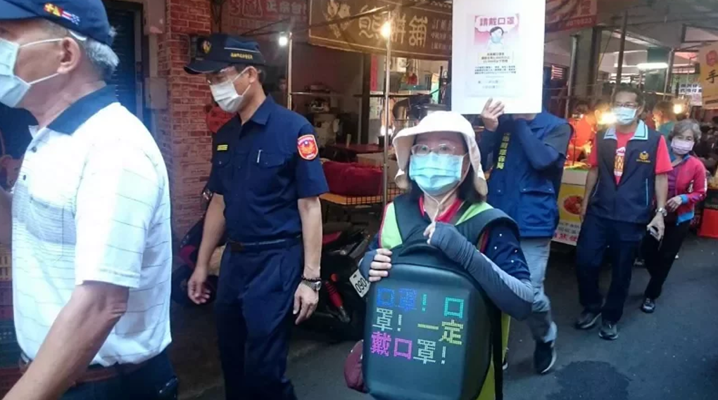 台灣地區高雄市小港警分局派警員到市場,提醒民眾戴口罩。/聯合報