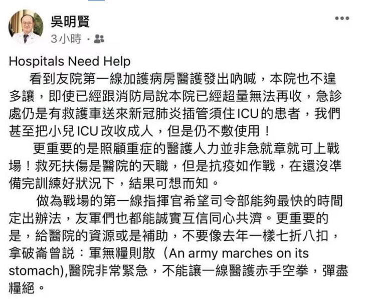 26日,台灣大學醫學院附設醫院(以下簡稱台大醫院)院長吳明賢亦在“臉書”發帖:“醫院需要幫助!(Hospitals Need Help!)”。他表示,台大醫院已將兒童病房改裝成重症監護室(ICU),以收治新冠危重症患者,但仍無法滿足需求。