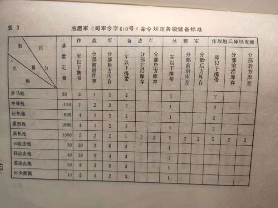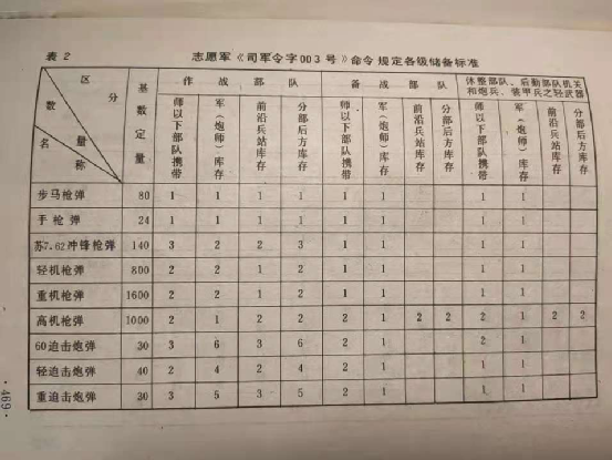 在《司軍令字003號》命令之後,志願軍後來又發佈過《司軍令字010號》命令,根據《010號命令》志願軍各部攜帶和儲存的彈藥基數又有了新的標準: