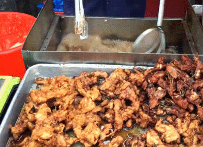 隨着每天賣出雞架的份數增多,油也會越來越入味,所謂酒越老越香,炸雞架油顏色越深越帶勁。