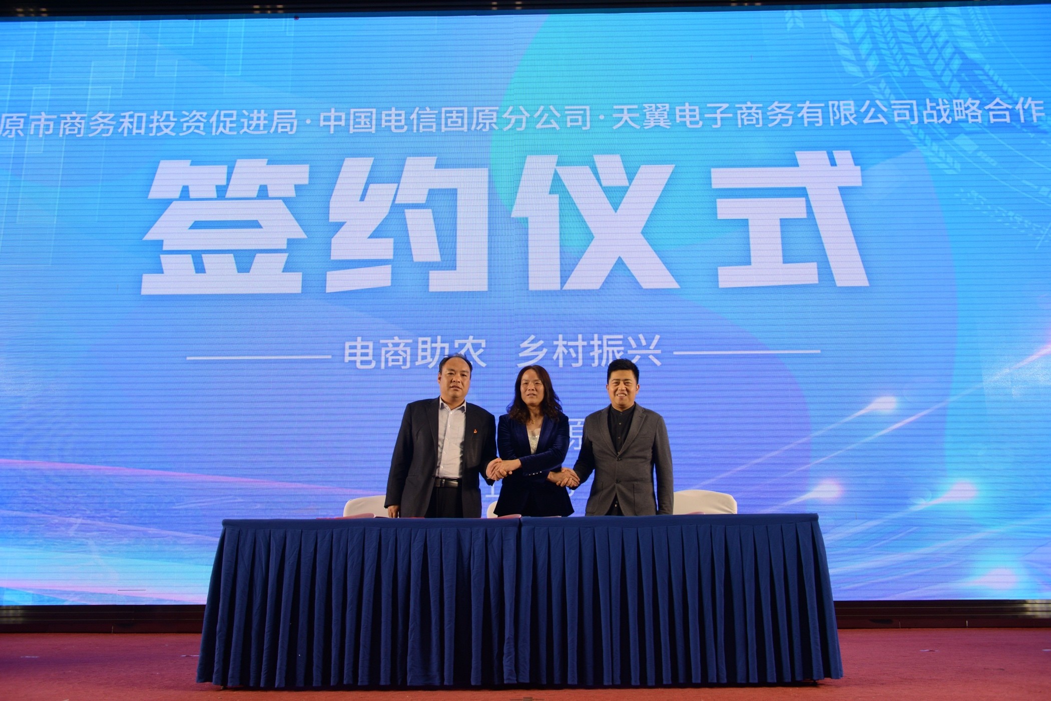 頒獎典禮上,自治區商務廳電商處班豔蓉處長為活動致辭,固原市商務局翟敬軍局長宣讀了本次大賽最終獲獎名單。現場頒發了50個固原市級電商示範村、50個固原市級電商先鋒團隊、固原電商十大優秀個人三大獎項,同時為隆德縣發展和改革局、彭陽縣發展和改革局頒發最佳組織獎。頒獎典禮進一步總結了固原電商大賽的活動成果,集中展示了固原本地的領軍電商人才和電商示範村,明確了固原電商的發展特色和產業定位,為鄉村振興戰略奠定了良好開局。最後,固原市商務局與天翼電子商務有限公司、中國電信固原分公司簽約戰略合作協議,三方後續將針對固原更多的優質特色商品進行大力宣傳與政策支持。