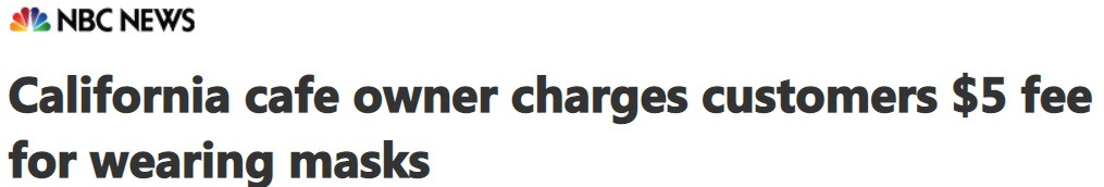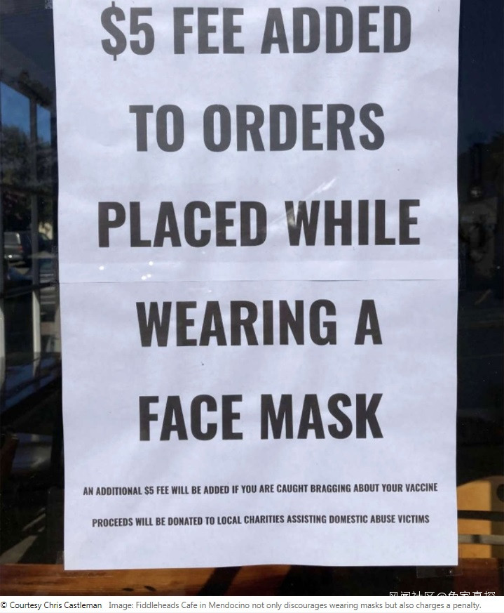 NBC: 週日,門多西諾的 Fiddleheads 咖啡館張貼了一個標誌,宣佈對在點餐時戴口罩的顧客收取費用。 34 歲的店主 Chris Castleman 説,今年 3 月,這家咖啡館宣佈,對於將面罩扔進垃圾桶的人,將繼續享受 50% 的折扣。