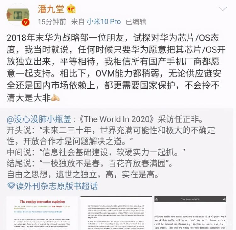 相比於小米的委婉,OPPO則是赤裸裸地拒絕了,就在華為邀請發出不久之後,5月24日OPPO公關高管在社交平台上表示:鴻蒙是基於AOSP開發的,在此基礎上添加了一些新內容,與安卓系統並沒有太大的區別。並且暗諷鴻蒙系統的適配和維護成本很高,如果適配了,很多數據掌握在華為手裏,沒有任何一家手機廠商願意這麼做,其實言外之意就是拒絕和鴻蒙合作,雖然這不能代表OPPO官方立場,當作為公關高管,應該代表一定OPPO的態度(説句實在話,看到這段有點生氣,難道使用安卓,命脈就在自己手上?)
