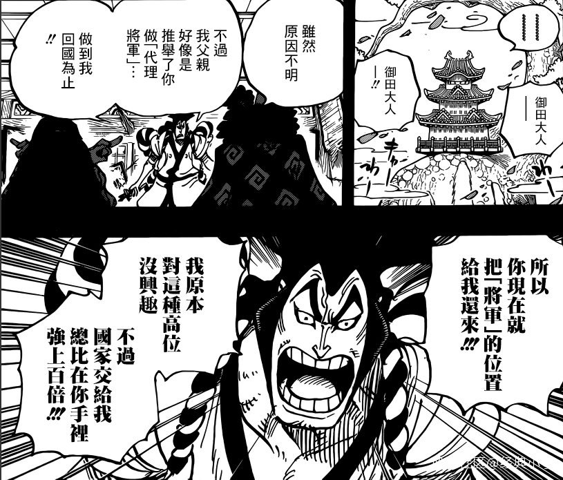 除非路飛等其他人打敗凱多海賊團和黑炭家後,桃之助宣佈廢除將軍大名制(如果有天皇制也宣佈廢除),宣佈自己就是個平民百姓,不然他依然是封建殘餘,比凱多更該被消滅的。不過桃之助會有這樣的思想嗎?912話,桃之助看他父親的日記,那日記連“永不加賦”的字樣都沒有吧。