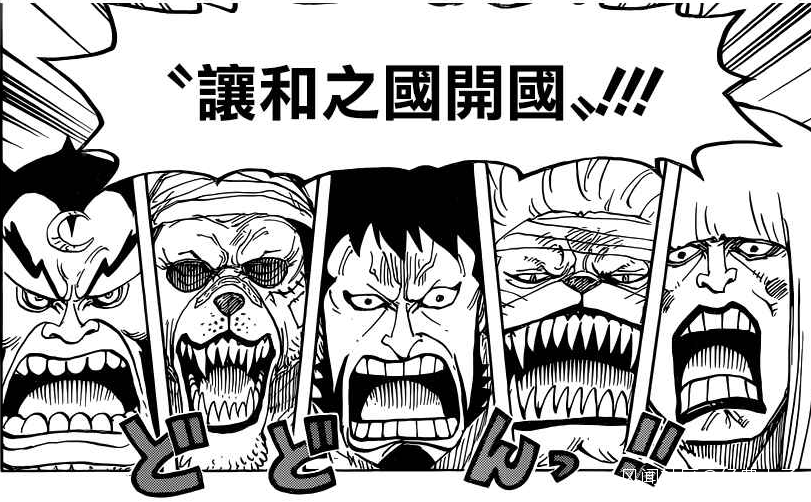 光月御田的“開國”是徹頭徹尾的謊言。819話,五個人喊出“讓和之國開國”,讓筆者一臉懵逼,這憑什麼能解救和之國?學過中國近代史就知道,洋務運動也是“開國”,但它並沒有解救中國,解救中國的是馬克思列寧主義,所以和之國的“開國”究竟是走資本主義道路還是社會主義道路?即便是資本主義道路也有不同的模式,是現在日本保留天皇(不知道和之國有沒有天皇),是美國的三權分立兩黨互扯後腿,還是拉美那種連黑社會和毒品都解決不了的“民主”。當然,桃之助做君主,可能社會主義和資本主義都不學,而是學溥儀或沙特阿拉伯。即便不談現實的世界,單單的“開國”不過是給世界政府和天龍人做奴隸罷了,或許可以學傑爾馬66,輸出武士對外侵略。赤鞘九人所謂的“開國”,僅僅是一句憑空而來的口號,沒有政治大綱,僅僅是盲目行動——他們甚至用實際行動來反對“開國”,凱多和黑炭大蛇與外界做買賣,這就是“開國”的一種方式,但赤鞘九人不僅沒有支持,甚至要對凱多和黑炭大蛇千刀萬剮。所謂“開國”,是光月御田自己都不屑於乾的事情。光月御田自己統治九里,連九里都沒打開。