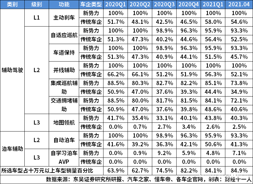 2020年Q1-2021年4月主流新能源車型,及智能輔助駕駛功能選裝佔比