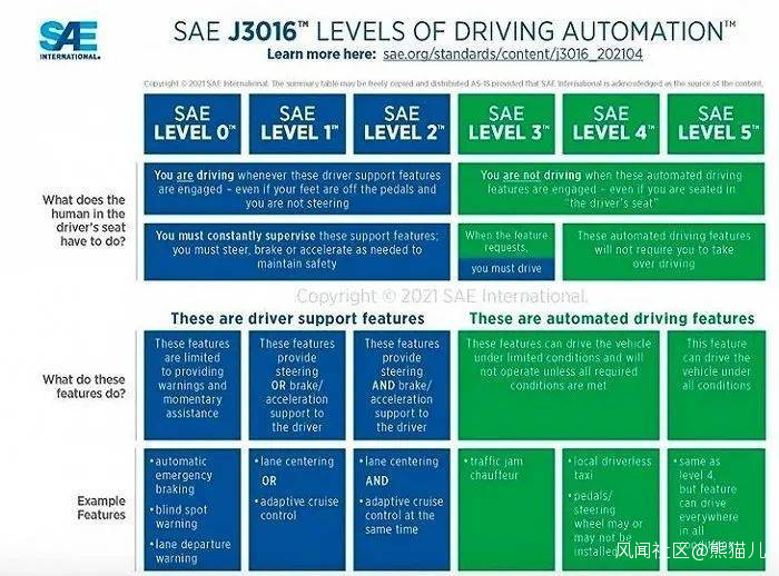 國際汽車工程師學會在今年4月最新調整了SAE自動駕駛分級標準,圖表中藍色部分為輔助駕駛,綠色部分為自動駕駛。