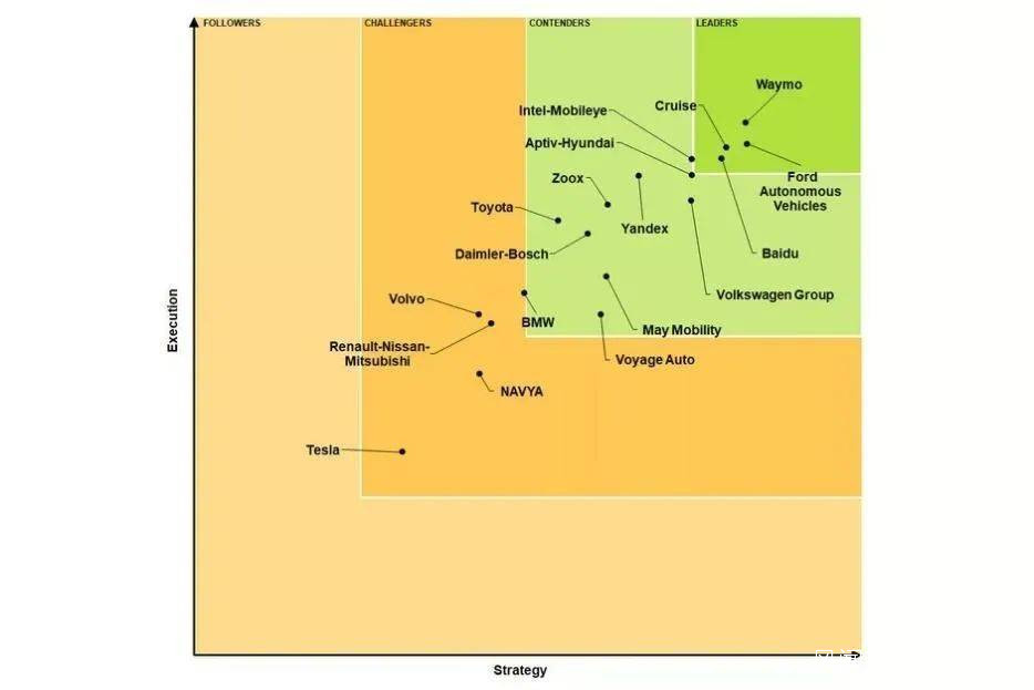 這張圖片出自Navigant Research Autonomous Leadership,每當有人説特斯拉自動駕駛不行的時候,這張圖片就會出現。在這張圖中,特斯拉的自動駕駛排名墊底。