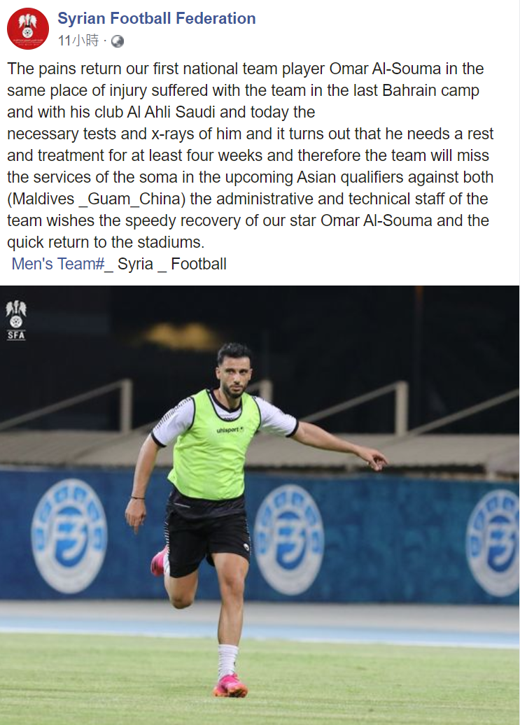 敍利亞方面,包括球隊頭號球星索馬(Omar AI-Souma)在內的三名國球員,將因傷將缺席本階段的所有比賽。