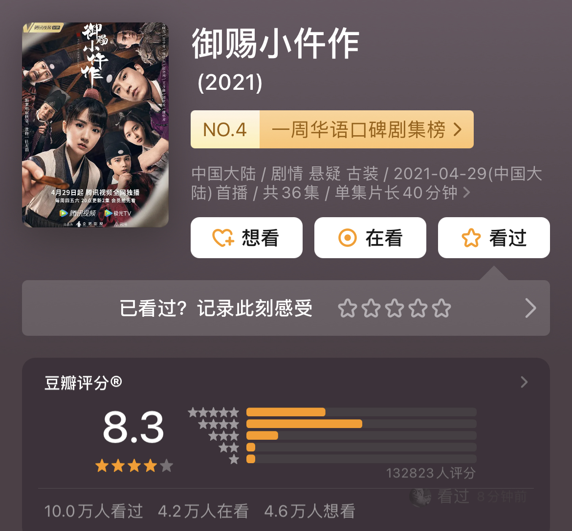 這是什麼概念?前陣子橫掃白玉蘭獎的《裝台》也是8.3,且《裝台》打分人數只有3萬,而《御賜小仵作》有超過13萬人參與了評分,連“現代仵作”@法醫秦明 都表示 “看了上頭”。