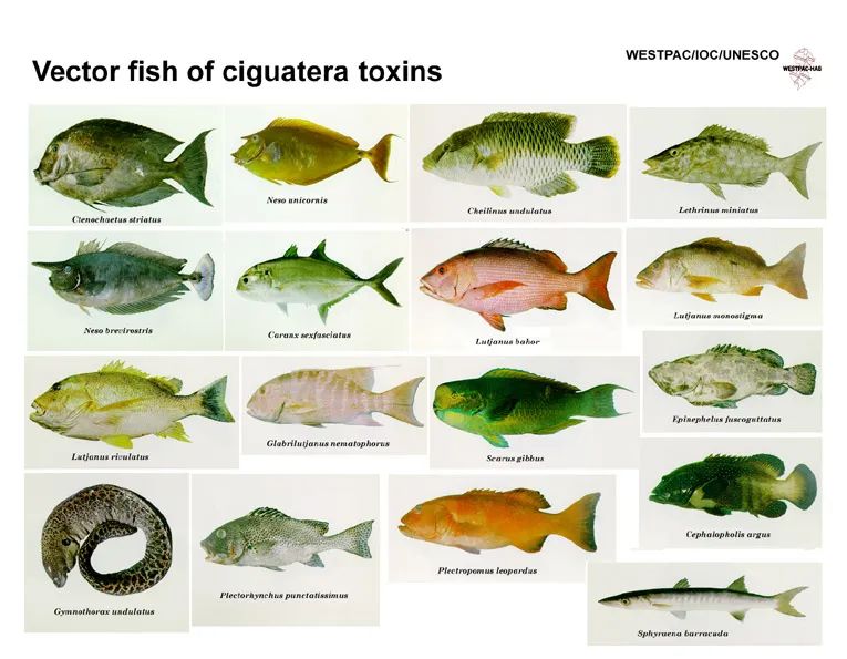 世界衞生組織介紹,超過400種珊瑚礁魚類含有西加魚毒素,其中包括超受歡迎的商業魚種,如石斑魚、海鱸魚和紅鯛。除了珊瑚礁魚類,在珊瑚礁出沒的螃蟹、龍蝦、海膽和貝類也都有可能攜帶西加魚毒素。