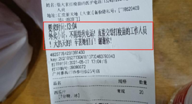 一位外賣小哥帶來幾袋外賣,裏邊裝着二十幾杯西瓜汁,外賣單上寫着:“外賣小哥,不用給我電話!直接交給打疫苗的工作人員!大熱天的!辛苦她們了!謝謝你”。