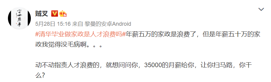 其實吐槽清華畢業生做家政的大多數都是人生的loser,天天除了恨人有笑人無以外啥也不會。他們之所以如此瞧不起這位做家政的清華畢業生,無非是自己壓根沒有機會獲得這樣的職位,要不然他們跑得比西方記者都快。