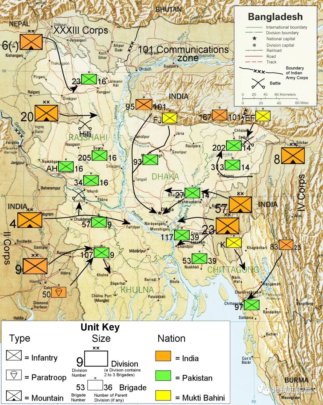 1971年,孟加拉獨立戰爭爆發,起義部隊面對成建制的巴基斯坦軍隊,當然是非常無力的。如果沒有外部力量的干預,這場起義多半會被撲滅。然而當時南亞次大陸的國際關係高度緊張,印度與巴基斯坦長期敵對,自然不會放過這一次讓巴基斯坦分裂的機會,開始大力支持孟加拉國獨立。