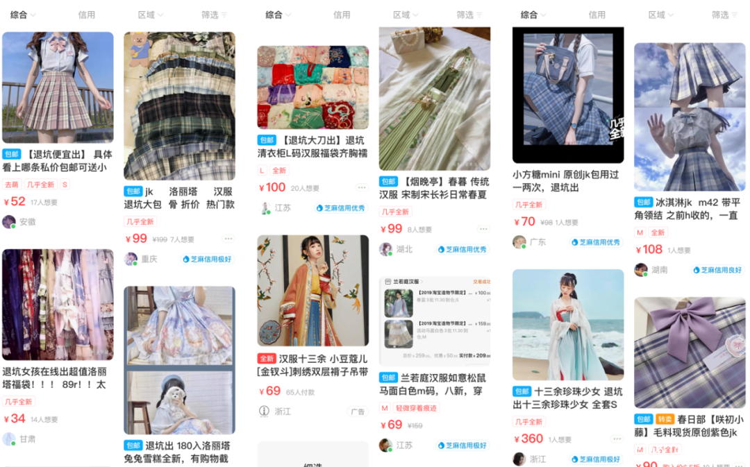 不僅僅是漢服,曾被譽為破產三姐妹的JK制服和洛麗塔小裙子們,在海鮮市場的行情亦是如此。