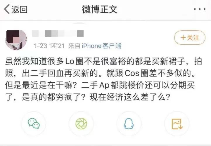 「雖然我知道很多LO圈不是很富裕的都是買新裙子,拍照,出二手回血再買新的。就跟cos圈差不多似的,但是最近是在幹嘛?二手AP都跳樓價還可以分期買了,是真的都窮瘋了?現在行情這麼差了嗎?」