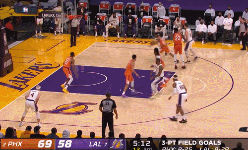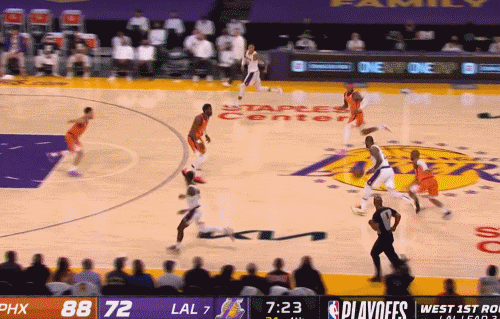 當然,首先是在拼搶上態度的升級。沒有戴維斯,湖人想贏球必然要在籃板上發力。事實上從G4下半場開始,就能看到他們在搶板上面的緊迫感。仔細觀察這個球,施羅德的三分還沒有出手,大莫已經從三分線外向籃下跑了,成功地抓到了這個籃板。