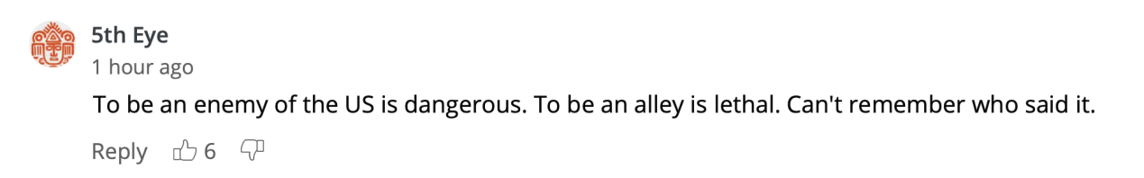 “當美國的敵人很危險,然而當美國的盟友是致命的。想不起來誰説的了。”