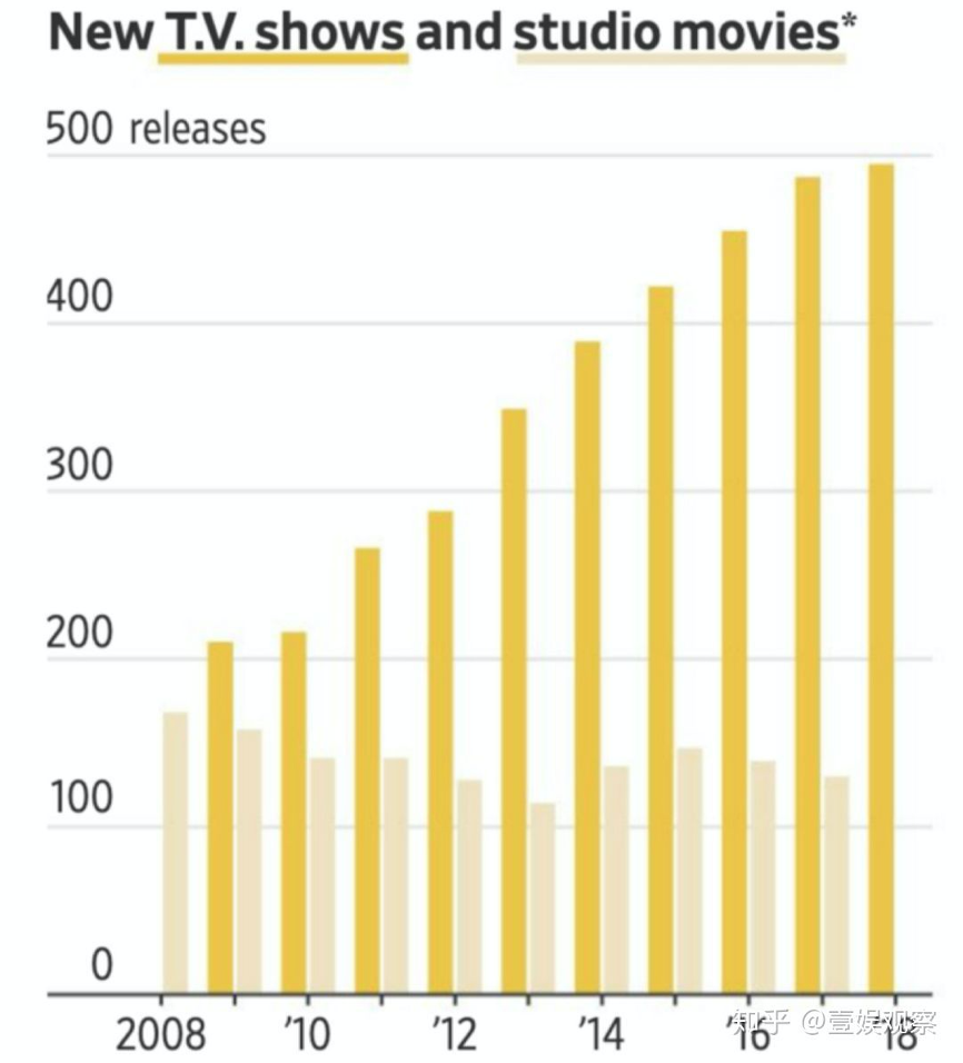 過去十年間,以Netflix、hulu為代表的流媒體平台提供的影片數量,拉開好萊塢五大的差距越來越大。2017年流媒體超出好萊塢五大的影片數量,已經達到了近5倍之多。