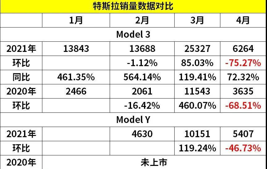 特斯拉銷量大跌的最重要源頭來自中國市場。據中汽協數據顯示,2021年4月份特斯拉銷量為25845輛,減去出口之後國內銷量只有11671輛,相較於今年3月份的35478輛,同比暴跌了67.10%,遠超腰斬的慘烈。