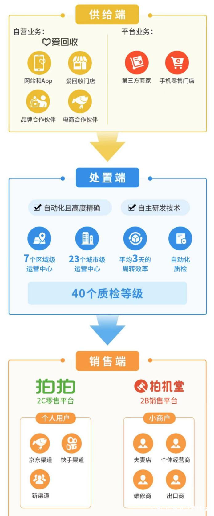 外界對萬物新生的瞭解,主要通過其手機回收業務和全國幾百家愛回收門店。其實,經過十年的發展進化,萬物新生已經從一個單一品牌(愛回收)的手機回收業務,發展成為一個覆蓋全產業鏈的多業務平台,旗下業務線包括愛回收(二手3C產品C2B回收平台)、拍機堂(二手3C產品B2B交易平台)、拍拍(二手優品B2C零售平台)及AHS Device(海外業務)等,橫跨產業鏈供需兩端,服務覆蓋從回收、檢測、評級、定價到再銷售的全流程。
