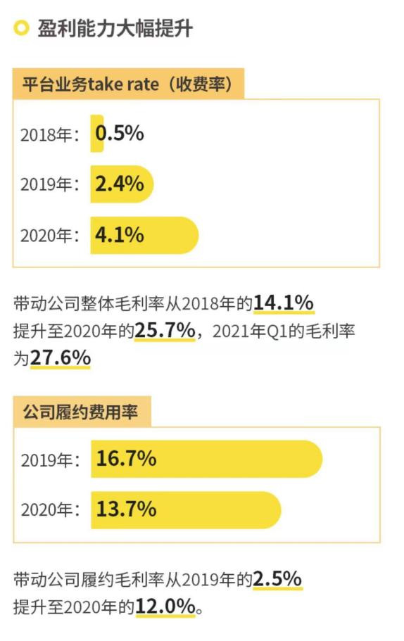 另外一個因素,也不容忽視。經分析,萬物新生在2018年和2019年的虧損,主要來自於對拍機堂平台業務的戰略性投入,這也正好應證了公司對外所講的“在拍機堂平台上投入超過1億美金”。隨着拍機堂平台業務逐漸成熟,平台收費率逐步提升(2018年0.5%,2019年2.4%,2020年4.1%,2021Q1 4.25%),集團的平台服務收入從2020年Q1的8610萬元增加至2021年Q1的2.039億元,增幅為136.8%。平台服務性收入的快速提升,不僅帶動整體毛利率快速提升至2021年Q1的27.6%,也帶動履約毛利率從2019年的2.5%提升至2020年的12.0%。