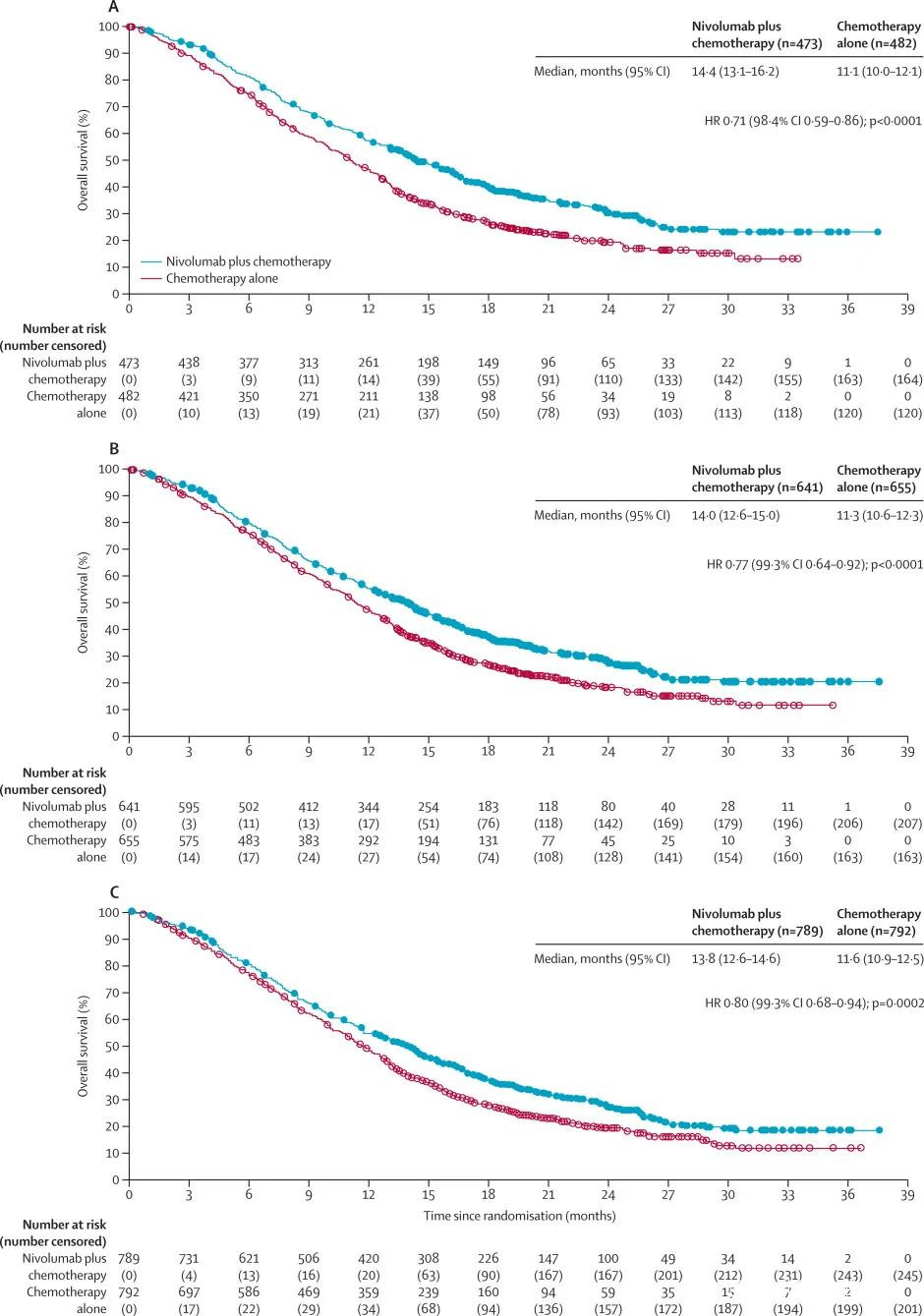 這一獲批主要是基於大型隨機3期臨牀試驗CheckMate-649的證據。近日,這項3期試驗結果在頂級醫學期刊《柳葉刀》主刊全文發表!經過同行評議的詳實數據再次表明,在化療基礎上增添免疫療法,刷新了這部分患者的生存期。