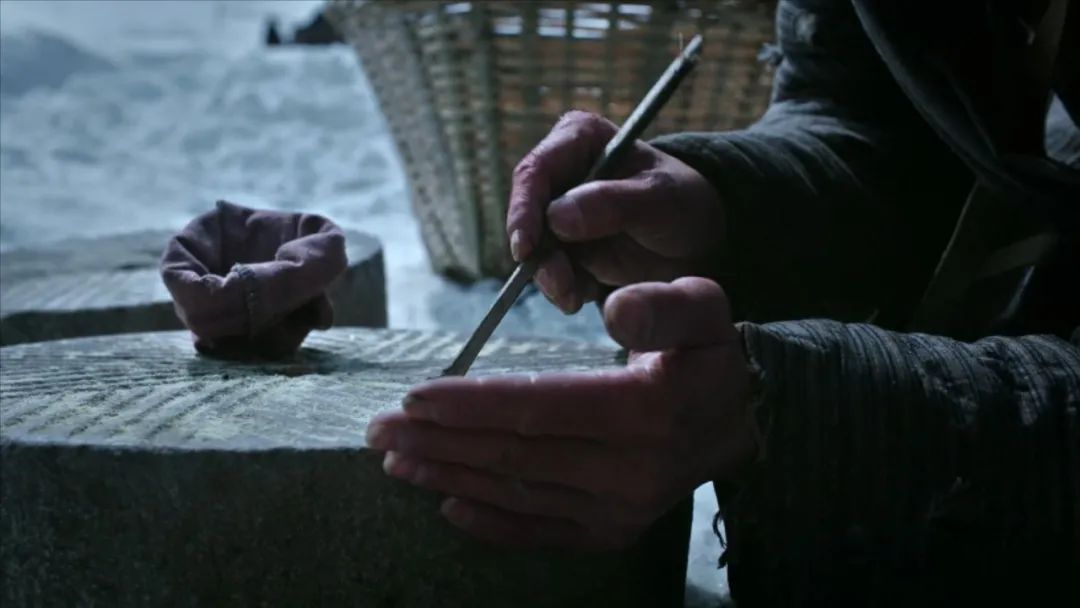炊事員沖天炮拿着根樹枝,不斷往外劃拉殘留在石碾子表面縫隙中的青稞面。
